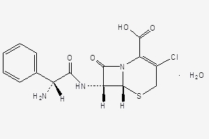 | Chemical name: | (6R,7R)-7-[(R)-2-Amino-2-phenylacetamido)-3-chloro-8-oxo-5-thia-1-azabicyclo[4.2.0]oct-2-ene-2-carboxylic acid monohydrate |