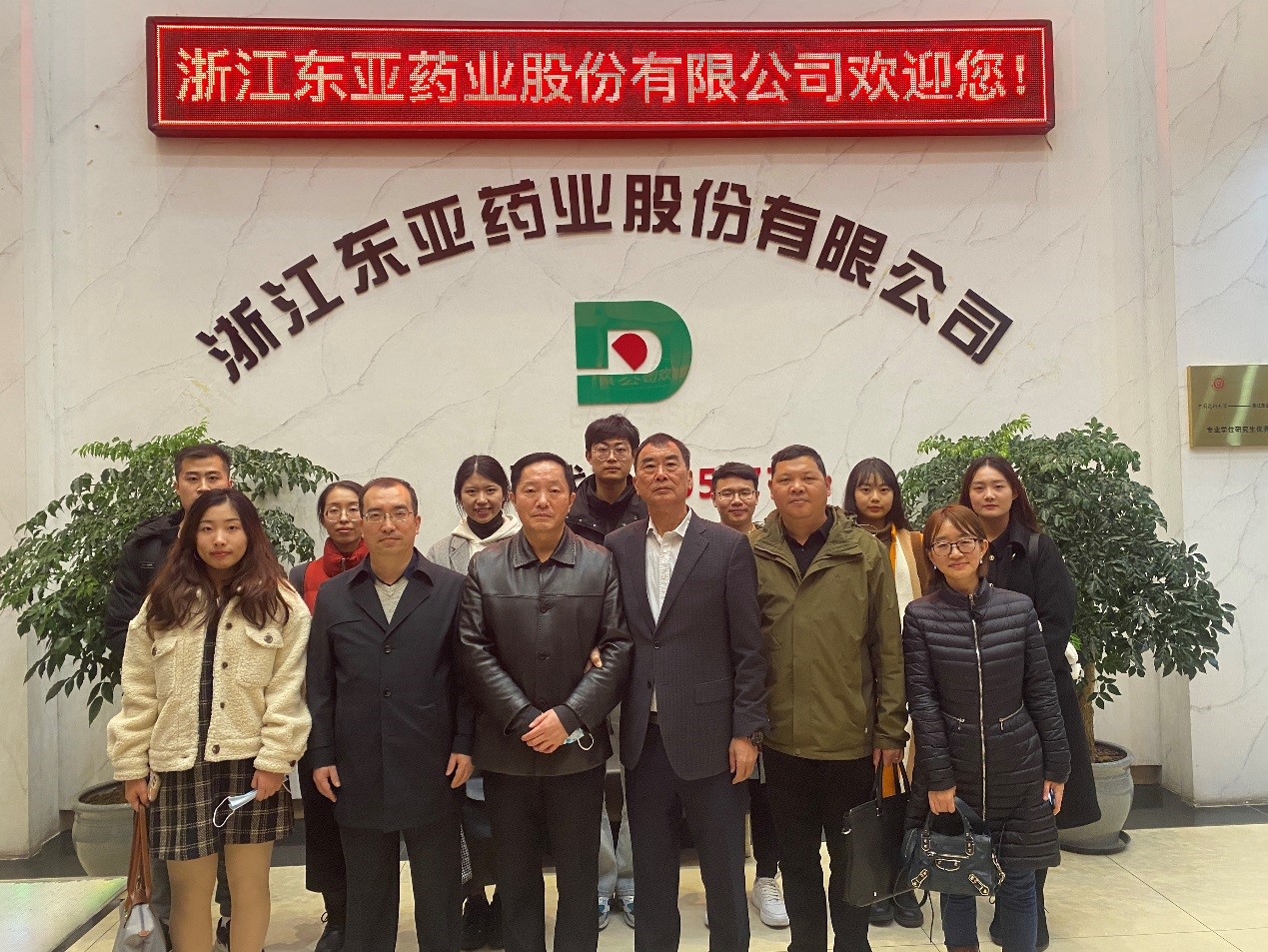 12月8日,中国药科大学研究生院刘会胜科长与学校梁毅教授、李建宏老师携多名研究生莅临东亚药业进行调研交流,东亚药业董事长池正明、质量管理中心总监刚丽霞热情接待。